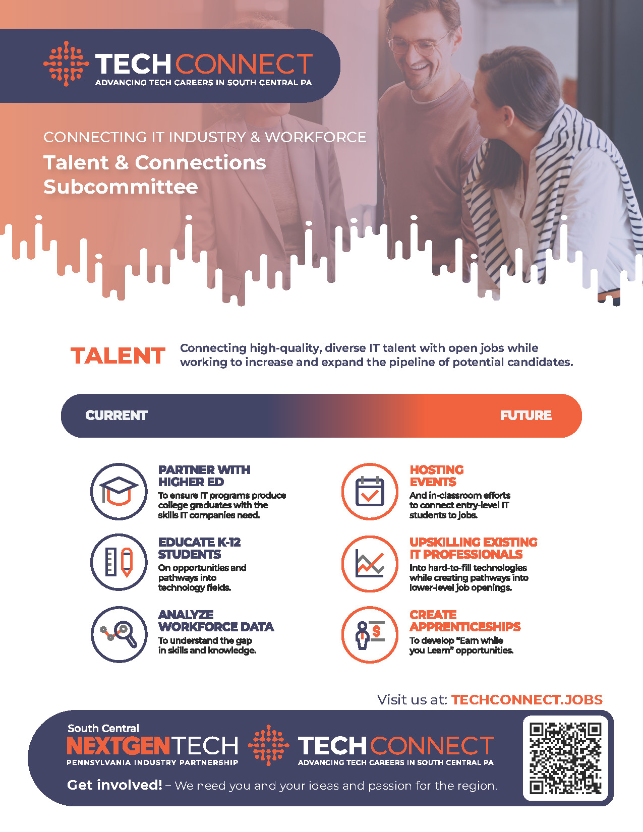 The Talent & Connections group seeks to connect high-quality IT talent with open jobs while working to increase and expand the pipeline of potential candidates in the South Central PA area.